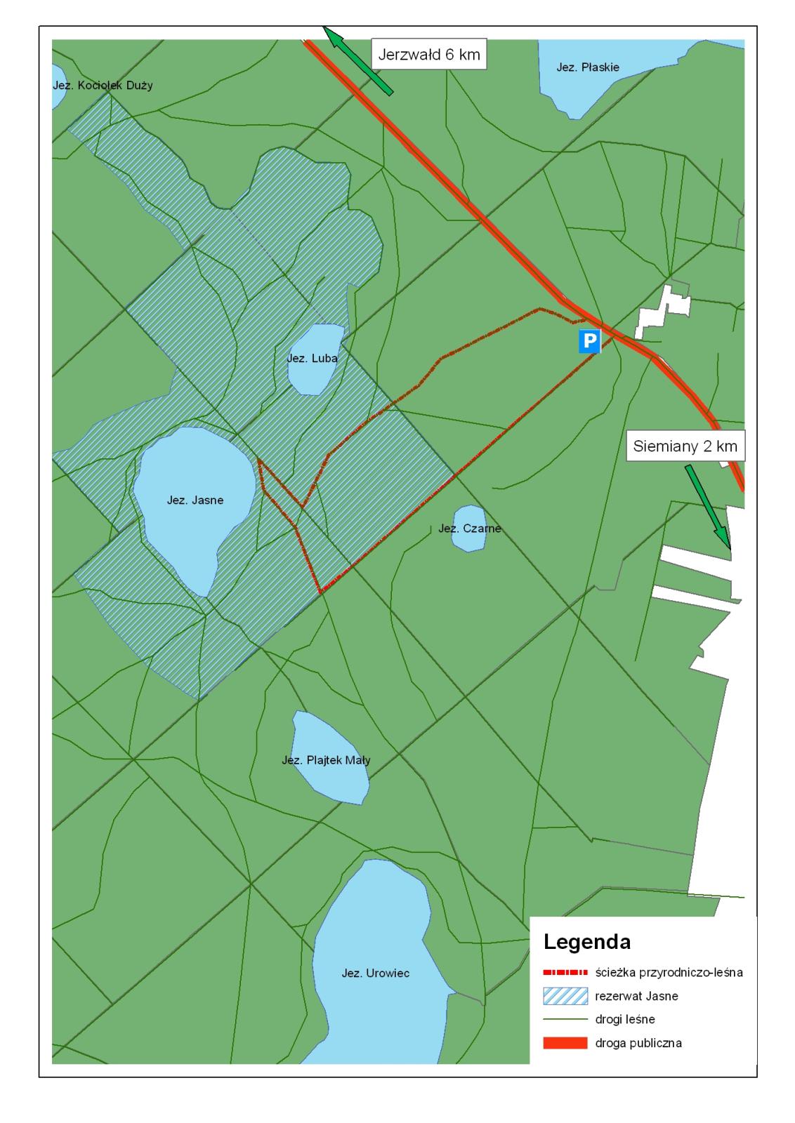 Dla najmłodszych i początkujących jest szlak żółty o długości około 3 km, dla bardziej zaawansowanych szlak czerwony (4,5 km cała trasa), z dodatkową trasą wokół jeziora Jasne, dla wytrawnych piechurów polecane jest połączenie zwiedzania ścieżki przyrodniczo-leśnej z odwiedzeniem rezerwatu kormoranów nad jeziorem Czerwica (cała trasa 11 km). Na ścieżce ustawiono tablice informacyjne, których celem jest przybliżenie zwiedzającym procesów zachodzących w lesie oraz prac wykonywanych przez leśników. Na końu trasy zwiedzający mogą odetchnąć w cieniu zadaszonej wiaty turystycznej.